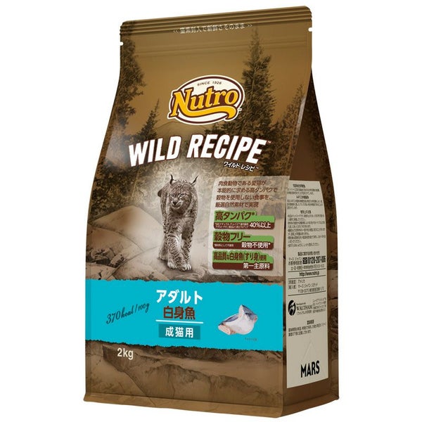 白身魚(すり身)、チキンミール、エンドウタンパク、鶏脂*1*2、エンドウマメ、ビートパルプ、タピオカ、ポテトタンパク、サーモンミール、アルファルファミール、亜麻仁*3、タンパク加水分解物、ユッカ抽出物、ビタミン類(A、B1、B2、B6、B12、C、D3、E、コリン、ナイアシン、パントテン酸、ビオチン、葉酸)、ミネラル類(カリウム、カルシウム、クロライド、セレン、ナトリウム、マンガン、ヨウ素、亜鉛、鉄、銅)、アミノ酸類(タウリン、メチオニン)、酸化防止剤(ミックストコフェロール、ローズマリー抽出物、クエン酸)*1 ミックストコフェロールで保存 *2 オメガ6脂肪酸源、*3 オメガ3脂肪酸源