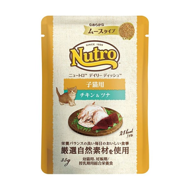 チキン、ツナ(DHA源)、鶏レバー、小麦、調味料(アミノ酸等)、ビタミン類(B1、B2、B6、B12、E、K、コリン、ナイアシン、パントテン酸、ビオチン、葉酸)、ミネラル類(Ca、Cl、Cu、Fe、I、K、Mg、Mn、Na、P、Zn)、タウリン、増粘多糖類