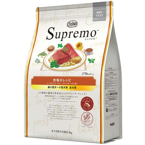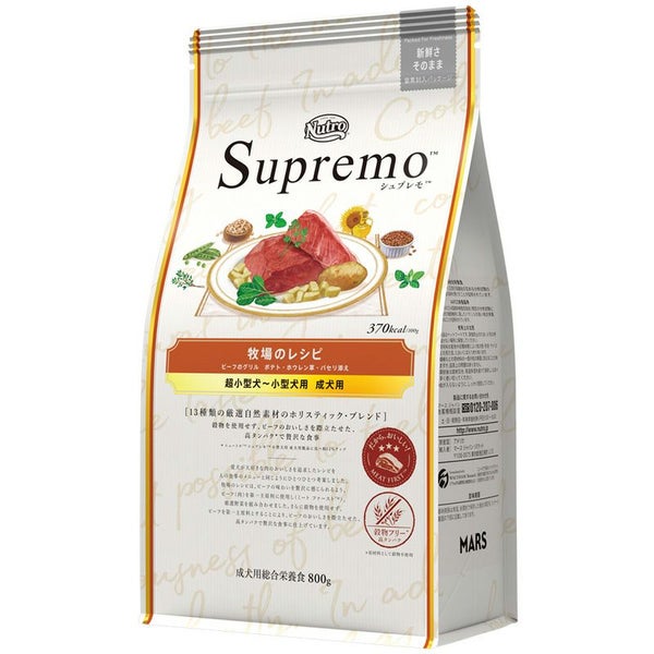 ビーフ(肉)*2、ポークミール、乾燥ポテト*3、エンドウマメ*4、ヒヨコマメ*5、ラムミール、鶏脂*1、ポテトでん粉、エンドウタンパク、ホウレン草*6、レンズマメ、タンパク加水分解物、亜麻仁*7、乾燥チコリー繊維、ひまわり油*1*8、タイム*9、パセリ*9、バジル*9、オレガノ*9、ビタミン類(A、B1、B2、B6、B12、C、D3、E、コリン、ナイアシン、パントテン酸、ビオチン、葉酸)、ミネラル類(カリウム、クロライド、セレン、ナトリウム、マンガン、ヨウ素、亜鉛、鉄、銅)、アミノ酸類(メチオニン)、酸化防止剤(ミックストコフェロール、ローズマリー抽出物、クエン酸)