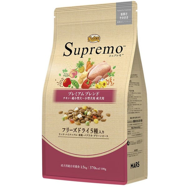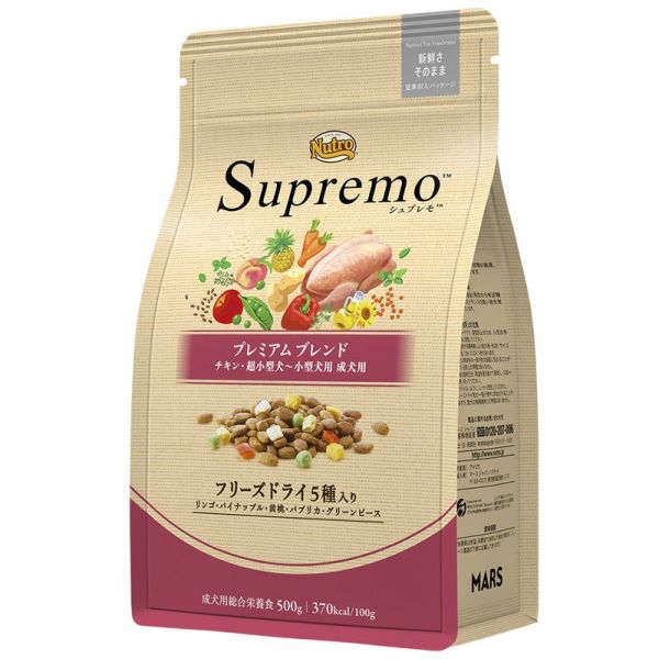 チキン(肉)、チキンミール、エンドウマメ、ラムミール、乾燥ポテト、レンズマメ、鶏脂*1、ポテトでん粉、ニンジン、ヒヨコマメ、タンパク加水分解物、乾燥チコリー繊維、エンドウタンパク、亜麻仁*2、ひまわり油*1*3、乾燥グリーンピース、乾燥パプリカ*4、乾燥黄桃*5、乾燥パイナップル、乾燥リンゴ、ココナッツオイル、バジル、パセリ、オレガノ、タイム、ビタミン類(A、B1、B2、B6、B12、C、D3、E、コリン、ナイアシン、パントテン酸、ビオチン、葉酸)、ミネラル類(カリウム、クロライド、セレン、ナトリウム、マンガン、ヨウ素、亜鉛、鉄、銅)、アミノ酸類(メチオニン)、酸化防止剤(ミックストコフェロール、ローズマリー抽出物、クエン酸)