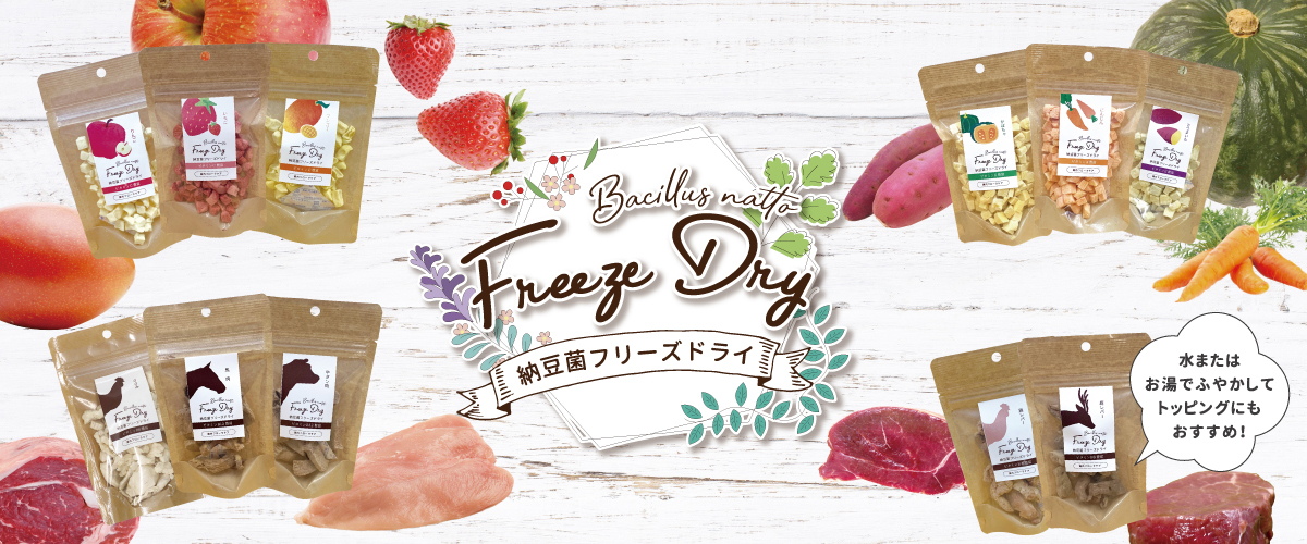 ドクターズチョイスから 新感覚フリーズドライ おやつサプリメントが誕生! お腹にやさしい腸内フローラケア ■ベイトに最適 ドッグショーのハンドリングなどで用いるつりエサにもおすすめです。 ■保存は常温で 素材の成分や風味の変化を抑えながら乾燥させたフリーズドライは保存性が高い為常温での長期保存が可能です。 ■軽量だから持ち運びも簡単 素材の形状も小さく細かい納豆菌フリーズドライはとても軽く、かさばらないので、おでかけなどの持ち運びにも最適です。 ■お湯につけると生肉に変身! お肉素材のものはお湯で戻すと生肉の香りと食感があり、ペットの食欲増進や普段食べているフードのトッピングなどにもお使い頂けます。 ■アレルギー・アトピーにも安心な素材を使用 アレルゲンになりやすい成分を避け、新鮮な素材をそのまま感想しているので、アレルギー体質のペットにも安心して与えて頂けます。 納豆菌フリーズドライ フルーツ・野菜 いちご りんご マンゴー にんじん かぼちゃ さつまいも ミート ささみ 馬肉 牛タン肉 鹿レバー 鶏レバー フリーズドライ一覧へ