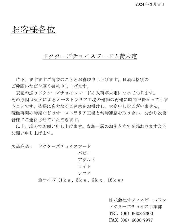 ドクターズチョイスフード欠品のご案内